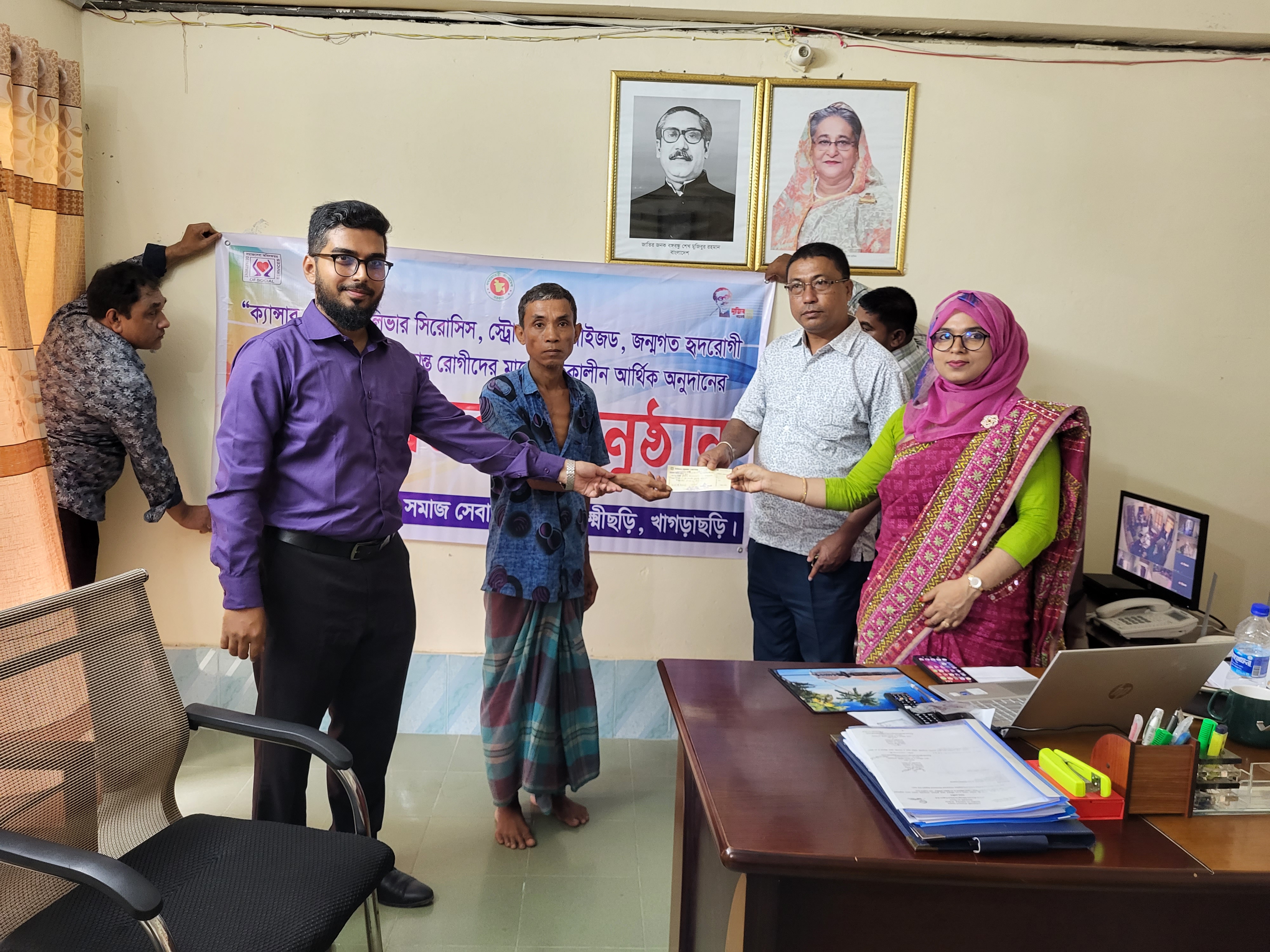 ২০২২-২৩ অর্থবছরে উপজেলা সমাজসেবা কার্যালয়,লক্ষীছড়ি কতৃ্ক ক্যান্সার,কিডনী,লিভার সিরোসিসে আক্রান্ত ০১ জন ব্যাক্তির মাঝে চেক বিতরণ অনুষ্ঠানে উপস্থিত ছিলেন উপজেলা চেয়ারম্যান মহোদয়, উপজেলা নির্বাহী অফিসার মহোদয়, উপজেলা সমাজসেবা অফিসার।